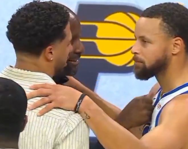 赛后,库里和步行者后卫哈利伯顿拥抱热聊。