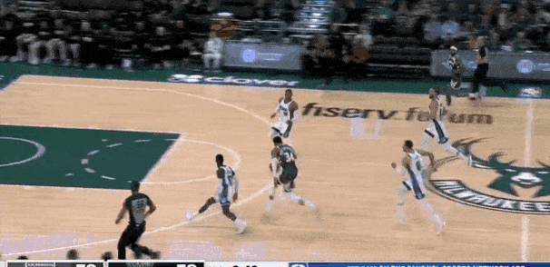 AJ-格林故意罚球不中,字母哥大鹏展翅抢到了前场篮板,奈何此时哨声响起,超时鸟……